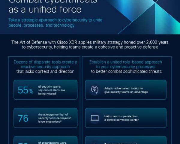June 4, 2025In ‘Combat cyberthreats as a unified force’, Cisco explores a transformative approach to cybersecurity that unlocks the power of unity across people, processes, and technology. It uses the paradigm of ‘The Art of Defense with Cisco XDR’, which draws on centuries-old military strategy. The infographic reveals how current security methods often miss critical alerts due to the scattered nature of tools and processes. Enter Cisco XDR Automation – a game-changer in the security landscape. It empowers teams to orchestrate a central command center, bolstering weak points and providing tools for a proactive defense. Such a holistic approach gives teams full visibility of their environment and the ability to respond to complex threats efficiently. It’s not just about combatting threats but learning from them to improve continually. The benefits: rapid incident response, maximized resources, and, overall, a strengthened cybersecurity posture. The content includes valuable insights, data, and a guided demo. Now’s the time to rethink cybersecurity with Cisco. Learn from industry leaders and transform your cyber defense today. Contact us to learn more and get started.