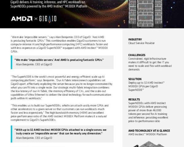June 5, 2025AI and HPC workloads demand speed, flexibility, and massive scale. This case study shows how GigaIO’s SuperNODE™ platform, powered by up to 32 AMD Instinct™ MI300X GPUs, delivers near-linear performance for AI inference and simulation. Designed to eliminate traditional server limitations, this solution provides composability, high memory bandwidth, and record-setting throughput. View the case study to understand how GigaIO and AMD are accelerating complex workloads, and connect with Pullin Cloud Technologies for guidance on deploying scalable, high-performance infrastructure.