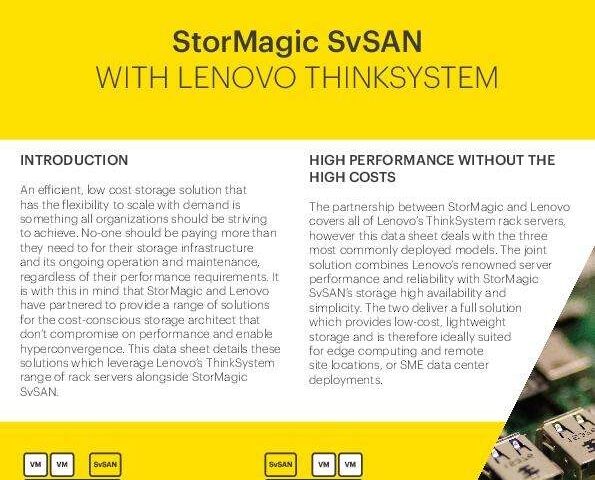 July 24, 2023StorMagic and Lenovo have partnered to bring you ThinkSystem servers with StorMagic SvSAN—and that means low-cost storage with greater simplicity and availability on Lenovo’s renowned ThinkSystem servers. To learn more, read this solution brief.